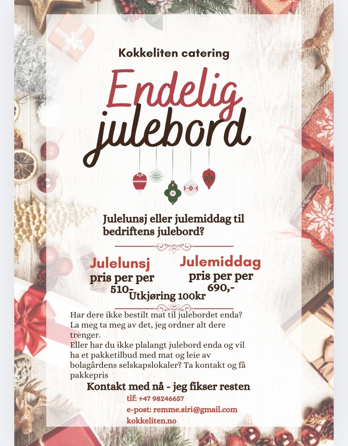 Gi kollegaene en smakfull og stressfri avslutning på året med vårt komplette julebordkonsept. Vi tilbyr både julelunsj og julemiddag levert direkte til bedriften – ferdig til å settes på bordet. Med tradisjonelle retter som ribbe, poteter, surkål, rød- og brun saus, medisterkaker og riskrem, får dere en ekte juleopplevelse uansett om dere ønsker en enkel servering eller et større opplegg. Har dere ikke booket julebord enda? Vi hjelper dere gjerne med både mat og lokaler, og skreddersyr løsninger som passer deres behov. Ta kontakt, så fikser vi resten.